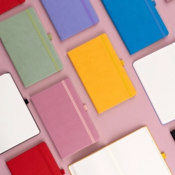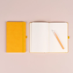 Praktičen in lahek pikčast zvezek v trendni rumeni barvi ima površino z drobno strukturo, na katero lahko odtisnete logotip podjetja. Zvezek ima trdo knjižno vezavo in zaobljene robove, zanko za svinčnik, elastični trak in tekstilni zaznamek. Pike imajo razmik 5 mm in so natisnjene na kakovostnem rumenem papirju.