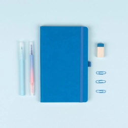 Praktičen in lahek moder zvezek z nekoliko bolj grobo teksturo površine je idealen za zapiske, načrtovanje in dnevne vnose. Zahvaljujoč trdi knjižni vezavi in elastičnemu traku bo vsebina vedno zaščitena, medtem ko držalo za svinčnik in tekstilni zaznamek povečujeta udobje pri uporabi.
