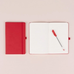 Vzdržljiv rdeč ovitek z grobejšo teksturo ščiti vaše zapiske, elastični trak pa jih varno drži zaprte tudi na poti.
