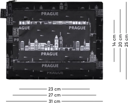 Vsaka torbica ima praktično zgornje zapiranje na zadrgo in kontrasten potisk s panoramo PRAGE. Zaradi črne barve in brezčasnega dizajna jih zlahka uskladite s katerim koli kosom prtljage. Set je odličen tudi kot stajliš spominek ali darilo za ljubitelje mesta.