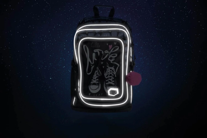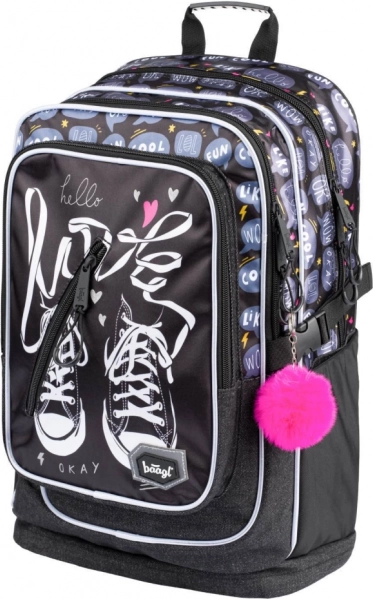 Stilski šolski nahrbtnik BAAGL iz linije CUBIC z motivom tenisk ponuja ergonomsko oblikovan hrbet, 3 prostorne predele z organizatorjem in žepom za 15" prenosnik, nizko maso 1,2 kg ter odsevne elemente za varnost. Vodoodporen material, nastavljivi trakovi in praktični žepi ga naredijo popolnega za šolo in prosti čas.