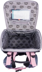 Nagibni sistem odpiranja omogoča dostop do vsebine kar iz šolske klopi. V notranjosti najdete organizator z elastiko, prozoren žep za urnik in dovolj prostora za učbenike ter malico.