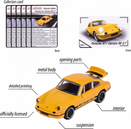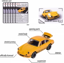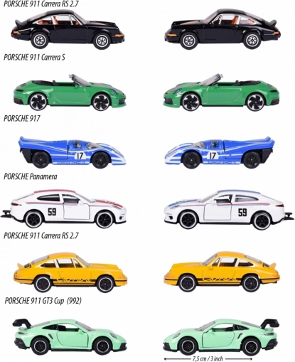 V izdaji najdete mešanico šestih legendarnih vozil: Porsche 911 Carrera S (zelena), Porsche 917 (modra), Porsche 911 Carrera RS 2.7 (črna in rumena), Porsche 911 GT3 Cup (992) (turkizna) in Porsche Panamera (bela). Vsebina pakiranja je naključna – konkretnega modela ni mogoče izbrati. Vsak avtomobilček je dolg približno 7,5 cm in dopolnjen z zbirateljsko kartico z informacijami, kot so hitrost ali število valjev.