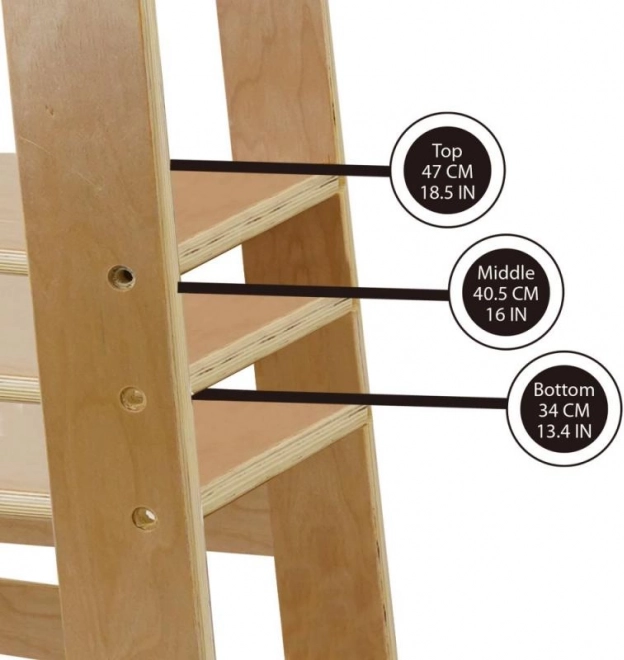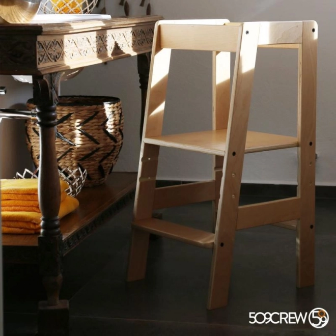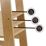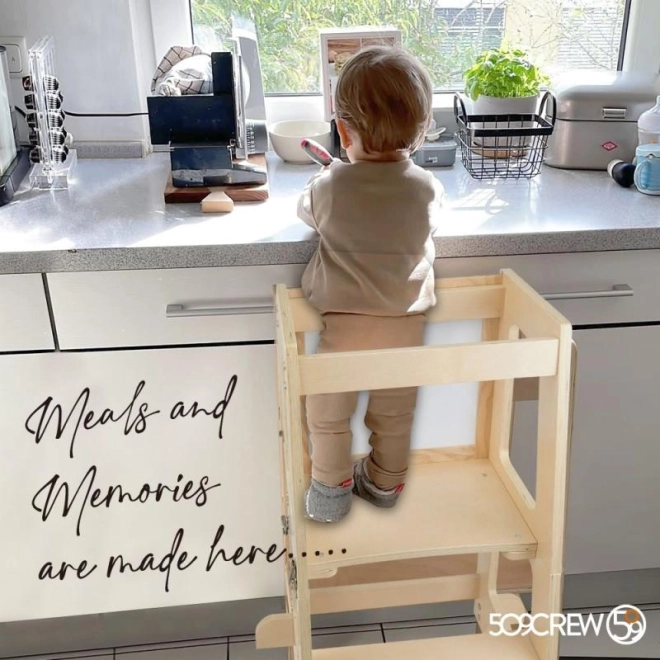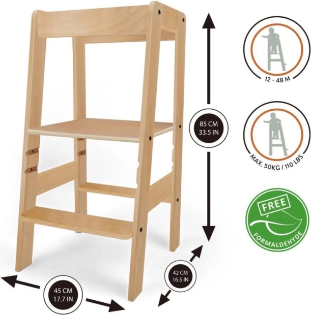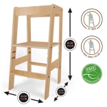 Odkrijte čar učenja z Učno stolp naravni, ki se enostavno prilagaja vašim potrebam in višini otroka zahvaljujoč trem stopnjam nastavitve platforme. To omogoča otrokom varen dostop do večine kuhinjskih pultov in kopalniških umivalnikov.