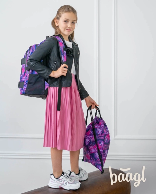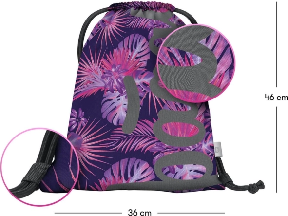 Vrečka ima privlačen tropski motiv v rožnatih in vijoličnih tonih, ki pritegne pozornost.