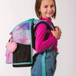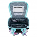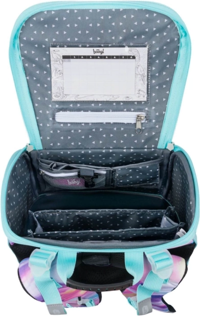 Aktovka se ponaša z novim preklopnim sistemom odpiranja, ki omogoča enostaven dostop do pripomočkov kar iz klopi. V notranjosti boste našli prozoren žep z urnikom, notranji organizator z elastiko ter stranska žepa iz trpežne mrežice, primerna za steklenico za pijačo.