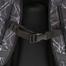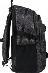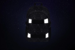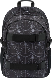 Dva trdna sprednja trakova omogočata varno pritrditev skateboarda. Sodobna črno‑bela zasnova z motivom Svetinje smrti in odsevnimi elementi zagotavlja, da boste vidni in videti odlično.