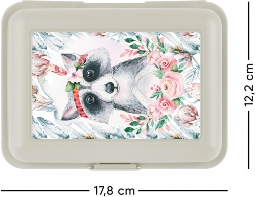 Praktična škatla za malico z motivom rakuna, ki bo navdušila ne le otroke. Eleganten in funkcionalen dizajn v bež barvi z delilnim pregradnim vložkom.