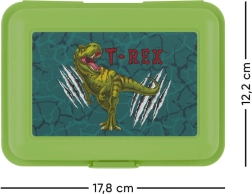 Kosilo škatla ima na pokrovu izrazit T-Rex dizajn s poudarjenim rdečim besedilom 'T-REX', kar povečuje njeno privlačnost za otroke.
