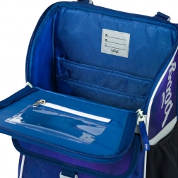 Novo preklopno odpiranje omogoča otrokom hiter dostop do pripomočkov kar iz klopi. V notranjosti ne manjka prozoren žep za urnik in premišljeni organizator z elastiko za fiksiranje zvezkov in učbenikov. Stranska žepa iz močne mrežice sprejmeta steklenico za pijačo, medtem ko izoliran prostoren sprednji žep z zaponko zaščiti malico.