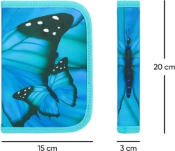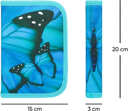 Elegantna peresnica v turkizno modri barvi z izrazitim motivom metulja združuje slog in funkcionalnost. Zahvaljujoč dvema notranjima preklopoma, gumiranim držalom in žepkom bodo pisala ter drobni šolski pripomočki vedno pregledno shranjeni in varno zaprti z zadrgo.