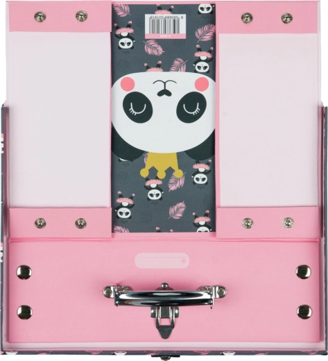 Kovinski ročaj je udoben za držanje, klasična zaponka pa varno zadrži vsebino v notranjosti. Kovček je kot nalašč za likovne potrebščine, zvezke, drobne igrače ali potovalne zaklade. Ljubek motiv pande in rožnati toni ga naredijo priljubljen dodatek za v šolo in na pot.