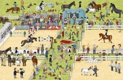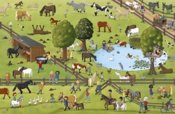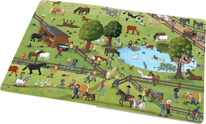 Ta otroška slikanica vas popelje na celodnevni izlet v svet konj in ponijev. Pokukali boste v življenje na konjski kmetiji, odpravili se boste na ježo, navijali na konjskih dirkah in opazovali žrebce, kobile in žrebičke na paši. Na vsaki dvojni strani boste našli ponavljajoče se like in živalice, ki jih lahko znova in znova odkrivate – interaktivna iskalnica spodbuja opazovalne sposobnosti, zbranost in veselje ob odkrivanju.
