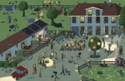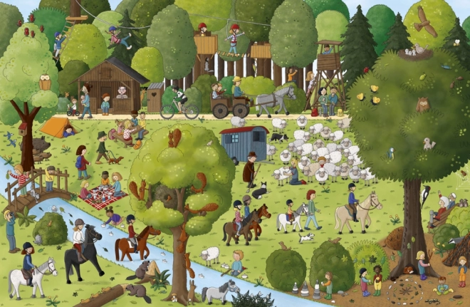 Na vsaki dvojni strani poiščite like in živalce ter spremljajte njihove drobne zgodbe – od živahnega dne do večerne slavnosti. Na igriv način uri pozornost in spomin.