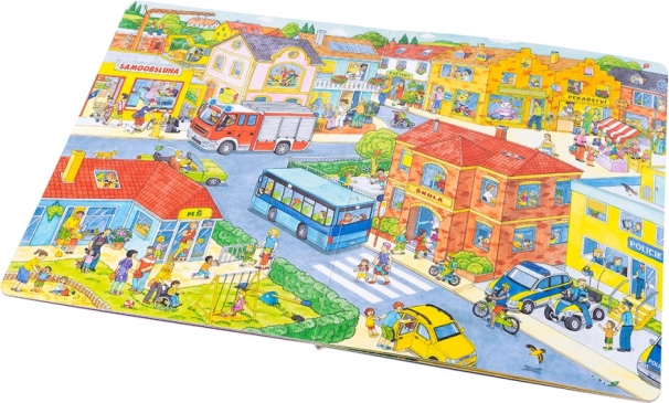 Ta velikanska slikanica je idealna za skupno branje in pripovedovanje. Otroci spoznajo, kaj se v mestu dogaja od jutra do večera – od dela smetarjev in nakupovanja, preko vrtca, gradbišča, gasilcev in policije, do popoldanske zabave v parku ter izletov k jezeru ali na kmetijo. Vsaka stran je polna spodbud za pogovor in iskanje podrobnosti.