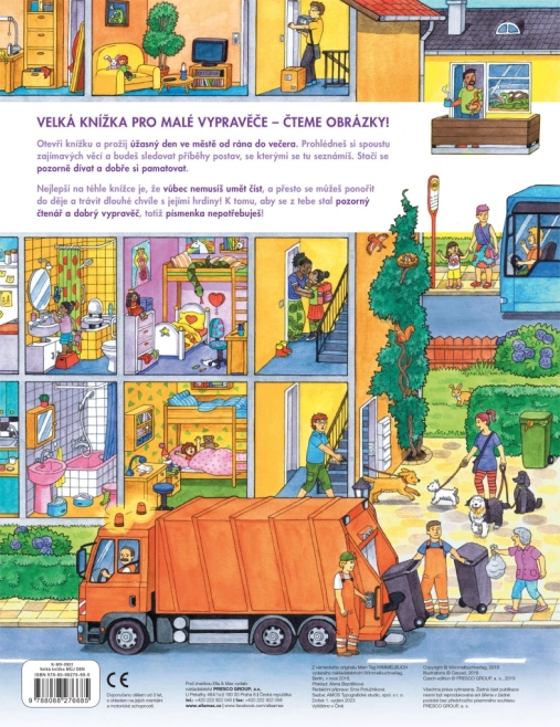 Odkrijte čar vsakodnevnih dogodivščin s to veliko slikanico, ki otroke popelje skozi celoten dan v mestu – od jutranjega vstajanja do večernega uspavanja. Bogate ilustracije, mnogo podrobnosti za pripovedovanje in zabavne prizore spodbujajo domišljijo, besedišče in razumevanje povezav vsakdanjega življenja.