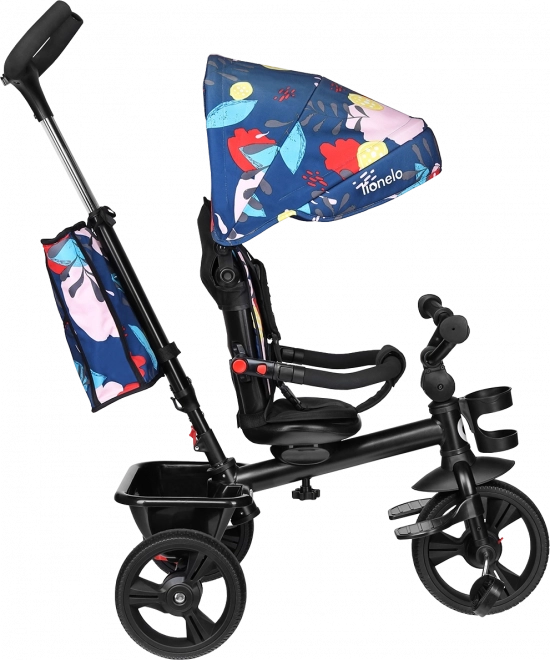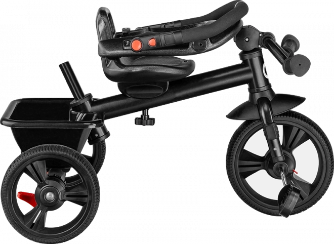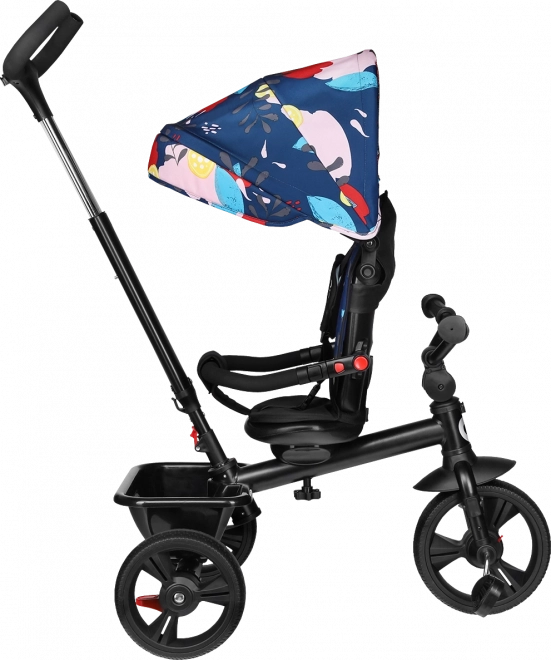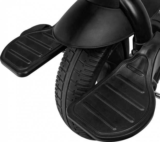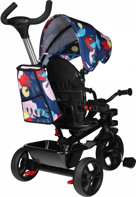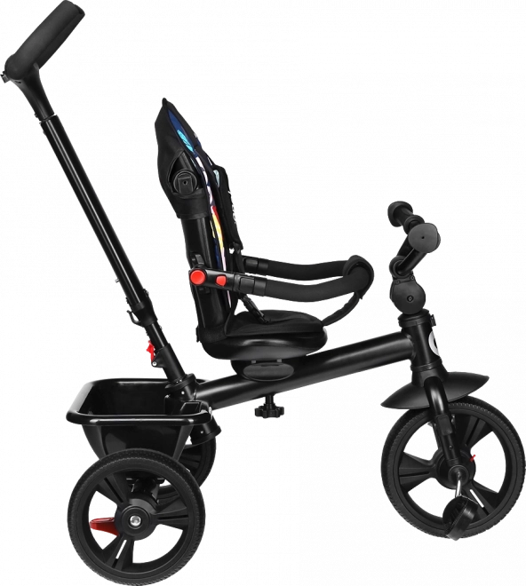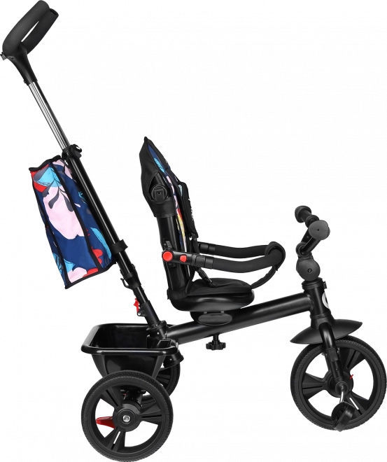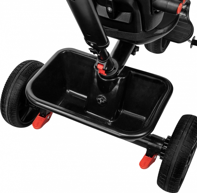 Za največjo varnost je tricikel opremljen s 3-točkovnimi pasovi, varovalnim lokom, odsevnimi elementi in dvojno zavoro na zadnjih kolesih. Starši bodo cenili po višini nastavljiv ročaj, enostavno zlaganje v kompaktno velikost ter praktične dodatke – košaro, torbo in držalo za steklenico.