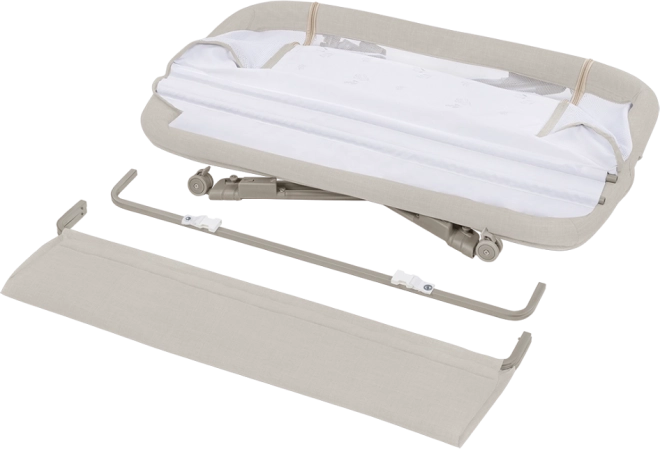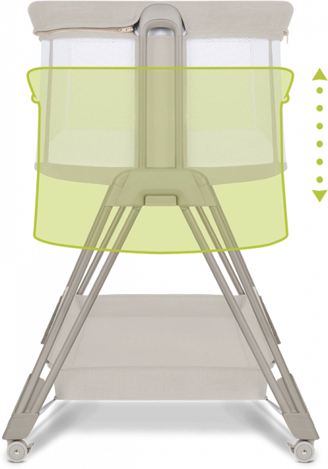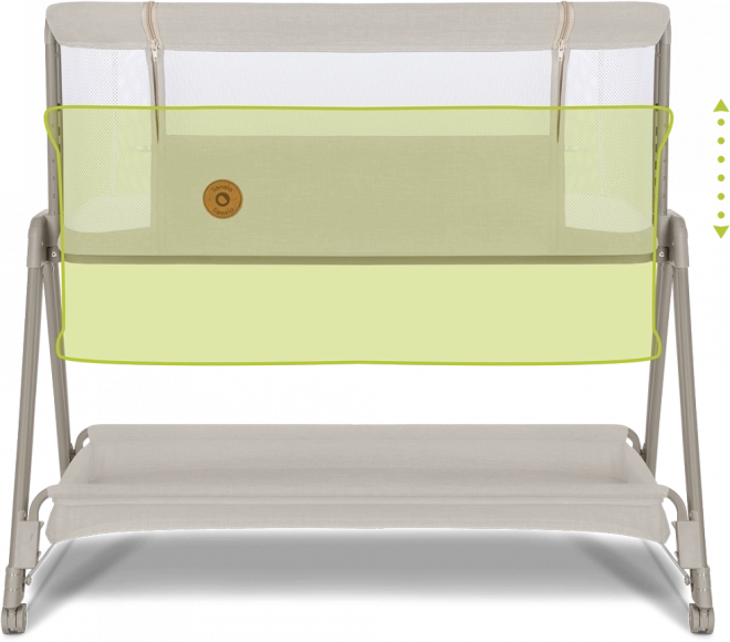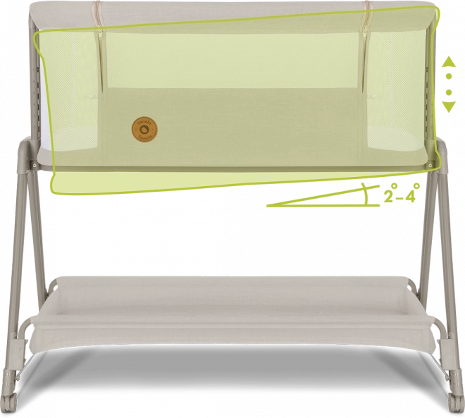 Zračne mrežaste stene spodbujajo kroženje zraka in vizualni stik, prevleko pa zlahka snamete in operete za največjo higieno. Z 7 stopnjami višine posteljico preprosto uskladite z višino svoje postelje; ob prehladu ali refluksu lahko vzmetnico nastavite v rahel naklon za večje udobje dojenčka.