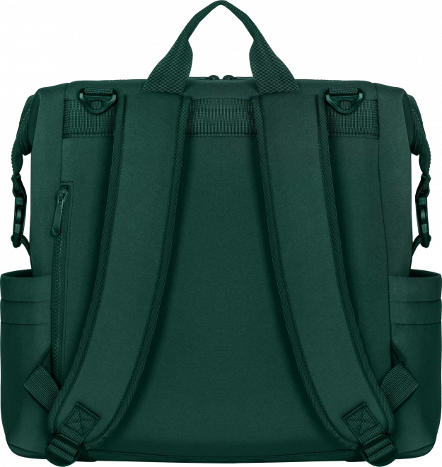 Nahrbtnik lahko nosite na hrbtu, ga s pomočjo odstranljivih univerzalnih sponk pritrdite na voziček ali uporabljate kot samostojen modni dodatek. Žep za previjanje služi tudi kot predelek za tablico ali prenosnik, medtem ko stranski in notranji žepi poskrbijo, da je vse pri roki. S sponkami lahko zmanjšate velikost, da se nahrbtnik prilega tudi pod sedež v letalu.