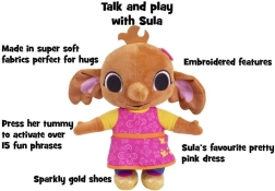 Angleško govoreča slonica Sula z zabavnimi frazami! Ljubka plišasta igrača je idealna za crkljanje. Sula, tako kot Bing, obožuje pustolovščine – naj bo to izlet v park ali dan v vrtcu, zajček je popoln spremljevalec. Pritisnite Suli na trebušček in prisluhnite njenemu britanskemu naglasu. Sula je izdelana iz mehke tkanine in ima čudovite izvezene podrobnosti. Približna velikost slonice je 30 cm. Izdelek vsebuje nezamenljive baterije. Povprečna življenjska doba baterije pri vsakodnevni uporabi je približno 6 mesecev. Primerno za otroke od rojstva dalje.