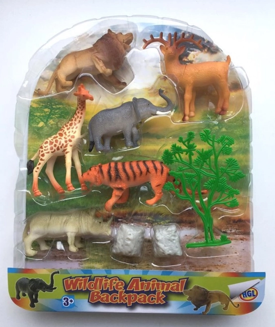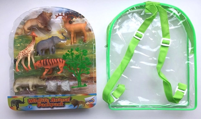 Zabaven set 6 figuric divjih živali v praktičnem nahrbtniku: lev, tiger, jelen, nosorog, slon in žirafa z dodatki. Prozoren nahrbtnik z nastavljivimi naramnicami olajša prenašanje in shranjevanje; figurice merijo približno 8 × 5 × 3 cm.