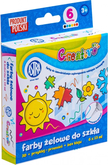 Gelne barve ASTRA CREATIVO za izdelavo vitražev in dekoracij na gladkih površinah. Po sušenju nastane prenosljiva gelna nalepka, ki prilagaja brez lepila na steklo, porcelan, ogledala, keramične ploščice in plastiko. Priročen set 6×15 ml za ustvarjalno delo.