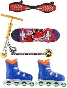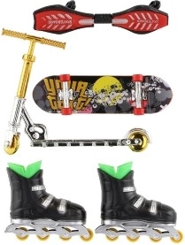 Ta prstni set prinaša štiri priljubljene mestne športe v mini izvedbi: skateboard, waveboard, in-line rolerje in skiro. Otroci lahko preizkušajo nove trike, ustvarjajo lastne proge ter razvijajo ustvarjalnost in spretnost. Zahvaljujoč kompaktnim meram set zlahka spravite v nahrbtnik in je odličen za zabavo kjerkoli.