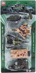 Popoln vojaški set 5 kosov za dinamično igro: helikopter, dve lovski letali, tank in avto. Igrače imajo vzvratni pogon in prosto vrteča se kolesa za gladko vožnjo in dolgotrajno zabavo.