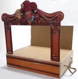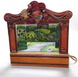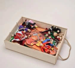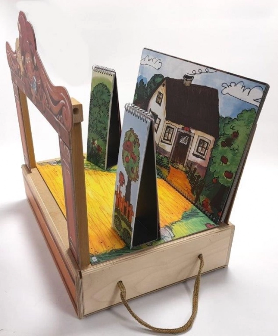 V paketu najdete 14 lesenih lutk, 11 barvnih scen, proscenij, zaveso in stranske kulise – vse pregledno shranjeno v leseni škatli z ročajem.