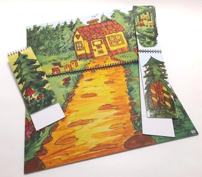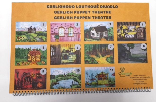 Sestavni del je 11 dvostranskih ali parnih scen na spiralni vezavi s podom: v gradu / pred gradom, pred hišo / v hiši, medenjakova hišica / v medenjakovi hišici, v gozdu / pri jami, v peklu / pri ribniku, v ribniku. Lutke vključujejo kraljevo družino, junake in pravljična bitja – idealno za klasične češke pravljice.