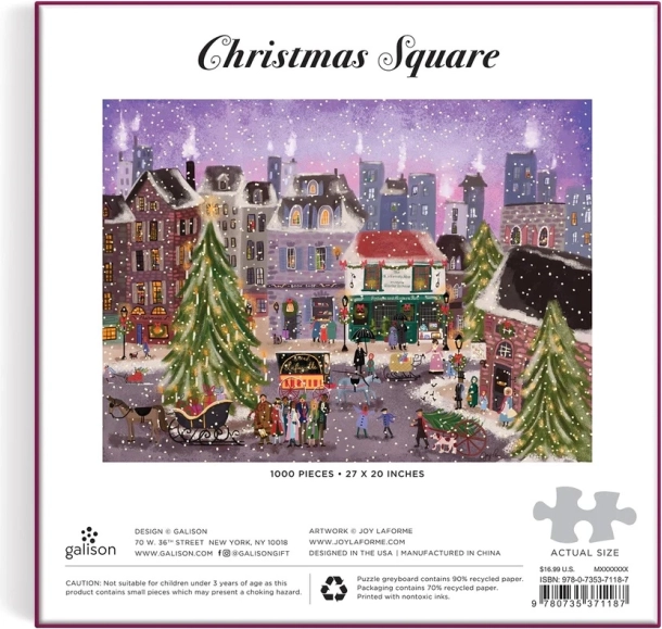 Uživajte v trenutkih miru in nostalgije s to božično sestavljanko, ki ponuja podroben pogled na božično vasico. Zahvaljujoč visoki vsebnosti recikliranega papirja in neškodljivega tiska z matiran konča je zagotovljena visoka kakovost in zvesto podajanje barv. Sestavljanka je pakirana v kakovostni škatli iz trajnostnih materialov s certifikatom FSC®. V paketu najdete tudi vodilno sliko za lažje sestavljanje.
