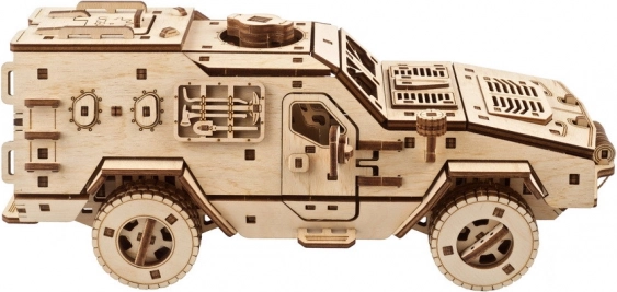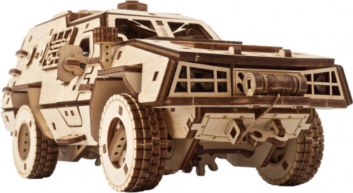 Sestavljanje je premišljeno in zabavno: vsi deli so natančno izrezani iz kakovostne vezane plošče, montažo opravite brez lepila in posebnega orodja. Ilustriran priročnik v 11 jezikih vas vodi skozi vsak korak; za najboljše delovanje mehanizmov je dovolj, da gibljive dele rahlo pobrusite in povoskate. Praktičen bonus je možnost enostavne zamenjave gumic v vzmetenju in vitli brez razstavljanja celotnega modela. Naravni les lahko pustite tak, kot je, ali ga dodatno okrasite z barvami in kamuflažnim vzorcem.