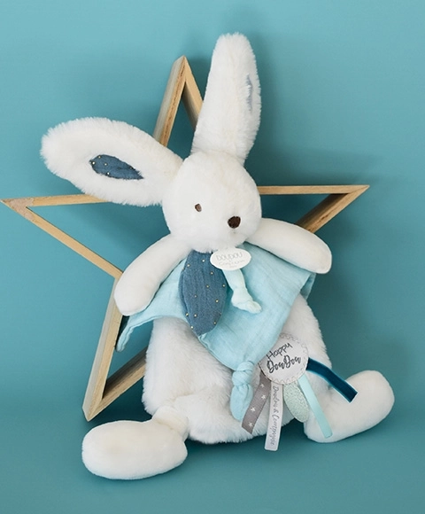 Ta darilni set znamke Doudou prinaša mehkega plišastega zajčka z ninico, ki bo razveselil dojenčka in starše. Slogovna izvedba z nežnimi trakovi in moderno modro barvo ga naredi za čudovit okras otroške sobice in priljubljeno igračo za crkljanje.