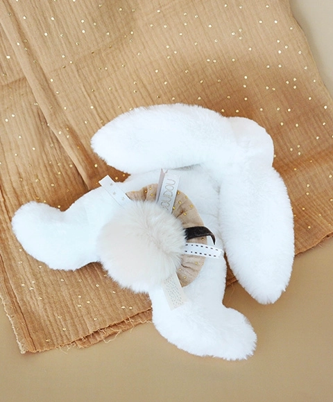 Prisrčen plišasti zajček v darilnem kompletu je izjemno mehak in vsestranski – služi kot prijatelj, blazinica in hkrati kot modna dekoracija otroške sobice. Zahvaljujoč vrhunskim materialom, nežnemu plišu in pomirjujočim barvam je idealen za dojenčke od rojstva dalje. Eleganten bež cofk in rutica igralki dodajata sodoben videz, darilna škatla pa iz nje naredi popolno darilo.