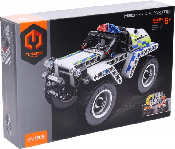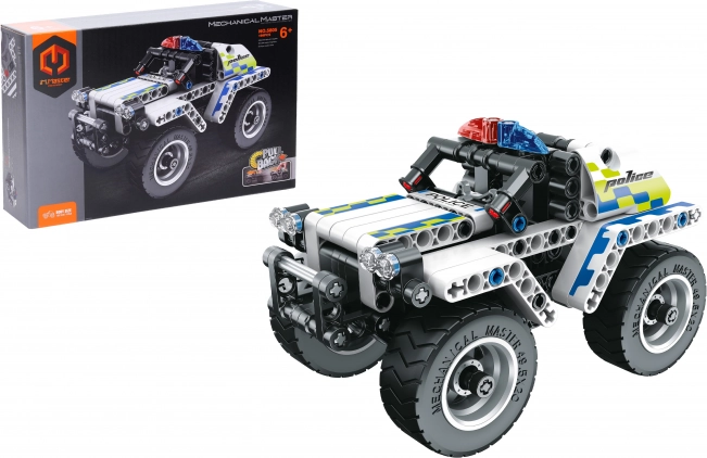 Ta zabaven komplet vsebuje vse za sestavo realističnega policijskega avtomobila z merami 16 × 10 × 11 cm. Zahvaljujoč mehanizmu vzmetnega pogona avto po sestavi zares vozi, kar otrokom prinaša še več akcije in veselja pri igri.
