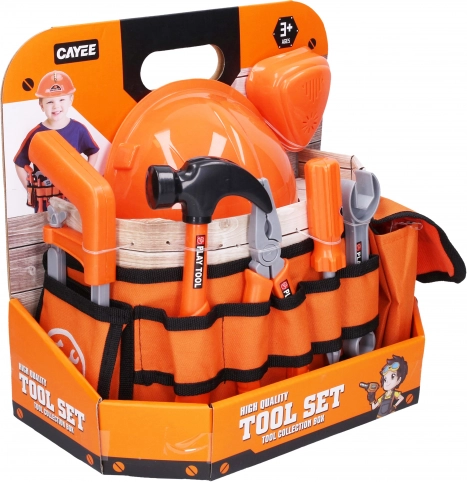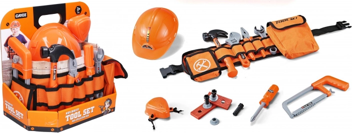 Praktičen otroški komplet za male mojstre vsebuje vse potrebno za varno igro in prve »naredi sam« poskuse. Del kompleta je tekstilni pas za udobno nošenje orodja, čelada in bogata oprema: maska, žagica, kladivce, kombinirke, nastavljivi ključ, izvijač, ključ, 2 deščici, 3 vijaki in 3 matice.