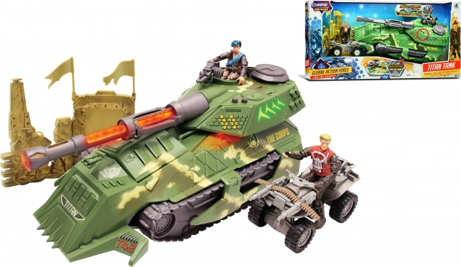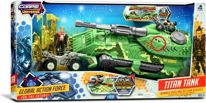 The Corps tank Titan 39 cm s svetlobnimi in zvočnimi učinki, 10 zvokov. V pakiranju tank, štirikolesnik, 2 vojaka, barikade in baterije. Pripravljeno za igro.