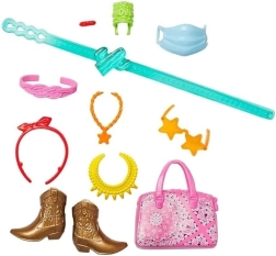Razširite svet lutke BARBIE s tematskimi seti dodatkov, ki navdihujejo domišljijo in neskončne zgodbe. Vsak set vsebuje 11 modnih dodatkov – od klobukov in torbic do edinstvenih tematskih elementov kot so koleščkarske drsalke ali morske dekoracije. Dodatke je mogoče poljubno kombinirati z drugimi oblačili in seti. Lutka ni priložena.