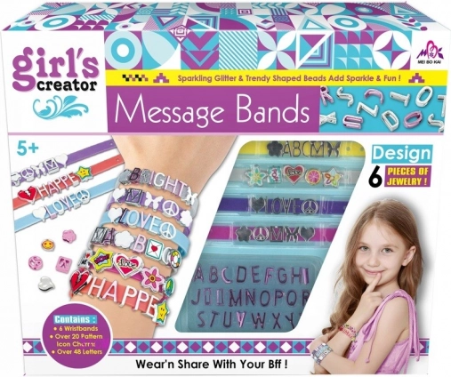 Kreativni komplet barvitih zapestnic za deklice s simboli in črkami. Čudovit okras in darilo, razvija domišljijo in fino motoriko.