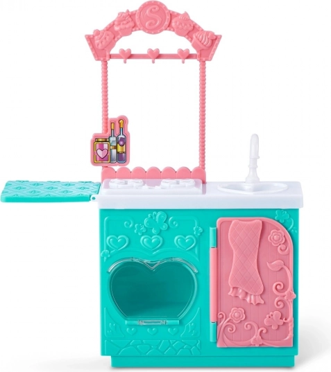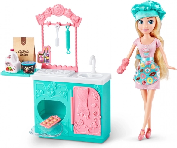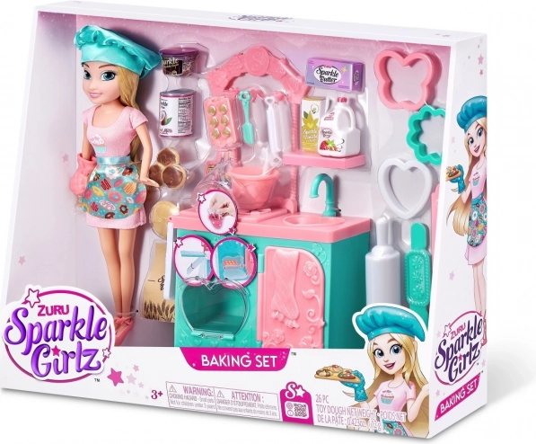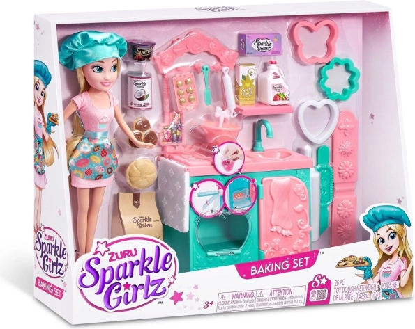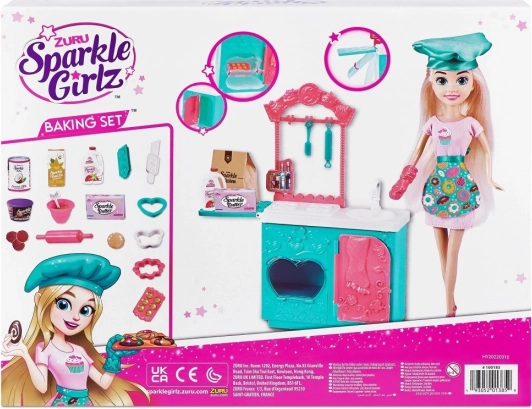 Set vključuje potrebne komponente za igro, vključno z majhnimi igračkami hrane, posodami, lopaticami in modeli, ki omogočajo realistično posnemanje peke. Odprite pečico, vstavite vanjo piškote in se pretvarjajte, da se pečejo! S pomočjo izmenljivih oblačil se punčka lahko kombinira z drugimi figuricami iz serije Sparkle Girlz.