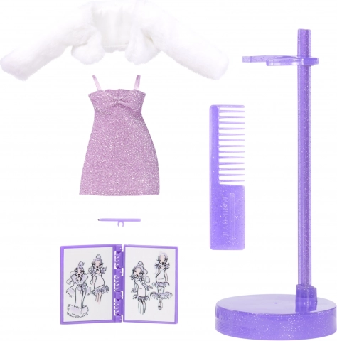 Punčka navduši z gostimi, valovitimi lasmi, primernimi za česanje, bleščečo obleko, mehko belo »krzneno« jaknico in vijoličnimi čevlji z visoko peto. V pakiranju najdete tudi glavnik, stojalo in majhen ilustriran zvezek za navdih pri ustvarjanju zgodb in modnih skic.