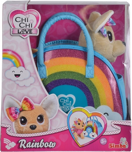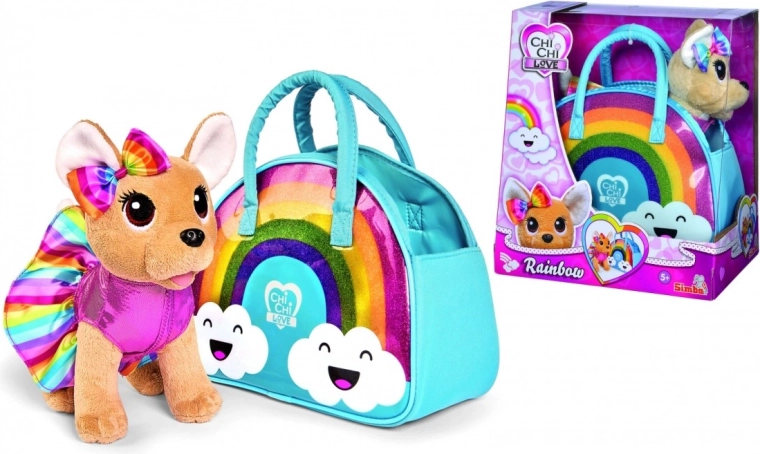 Plišasti kuža čivava, oblečen v prisrčen mavričen komplet z ujemajočo se pentljo, navdušuje z barvitim in bleščečim mavričnim potiskom.