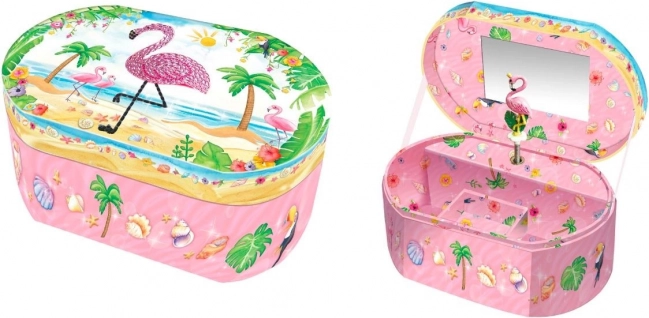 Glasbena skrinjica predvaja klasično melodijo. Ko jo odprete, se figurica začne vrteti. Ko melodija preneha igrati, skrinjico preprosto navijete. Deluje s posebnim mehanizmom in ne potrebuje baterij. Vključuje ogledalce in prostor za shranjevanje drobnarij.