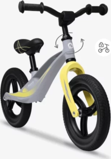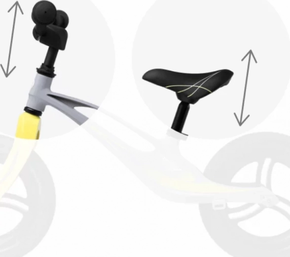 Blokada krmiljenja omejuje kot zasuka, nedrseči ročaji ščitijo roke, mehki ščitnik na krmilu pa duši udarce. Nastavljiva višina sedeža in krmila raste skupaj z otrokom.