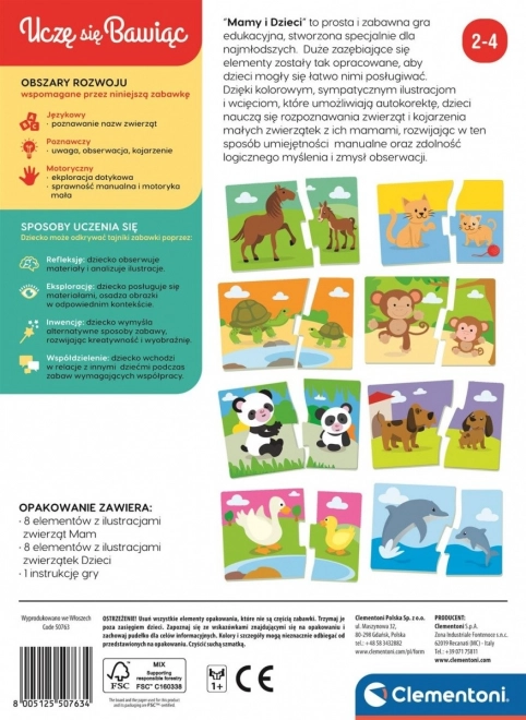 Zabavna izobraževalna igra za najmlajše, v kateri otroci povezujejo živalske mladiče z njihovimi mamami. Veliki, varni in vzdržljivi koščki so enostavni za držanje, barvite ilustracije pa spodbujajo logično razmišljanje, fino motoriko in opaznost. Idealna prva sestavljanka za starost 2–4 leta.