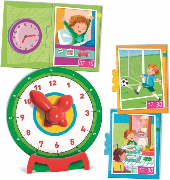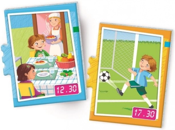 Zabavna izobraževalna igra, ki otroke nauči brati čas na uri. Zlaganje puzzlov in delo z veliko uro v paketu otrokom pomaga uriti povezovanje analogného in digitalnega časa z vsakodnevnimi dejavnostmi. Na zadnji strani koščkov najdejo opis aktivnosti in pravilen zapis časa z besedami. Idealno za starost 6–12 let, brez potrebe po baterijah.