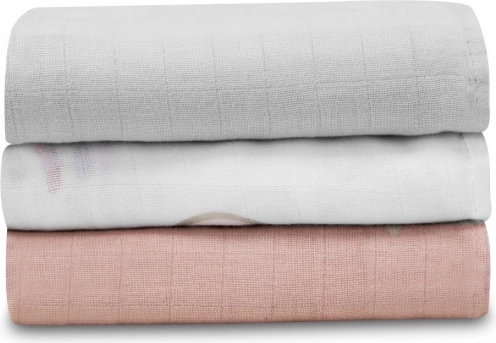 Tri barvno usklajene pleničke velikosti 70 × 70 cm služijo za povijanje, pri dojenju, hranjenju in kot podloga za previjanje – doma in na poti.