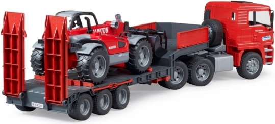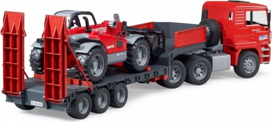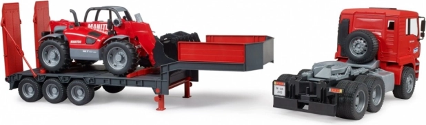 Ta robusten komplet združuje realističen model tovornjaka MAN TGA z nizkopodno prikolico in podroben teleskopski nakladač MANITOU MT633. Otroci bodo cenili funkcionalne elemente, kot so zložljiva ogledala, odpirajoč se pokrov motorja, odporno vetrobransko steklo, premične rampe in opore prikolice. Nakladač ima izvlečno in po višini nastavljivo roko ter odstranljivo žlico – pripravljen na vsak gradbeni izziv.