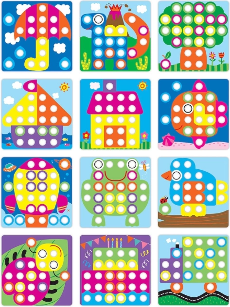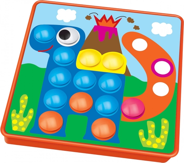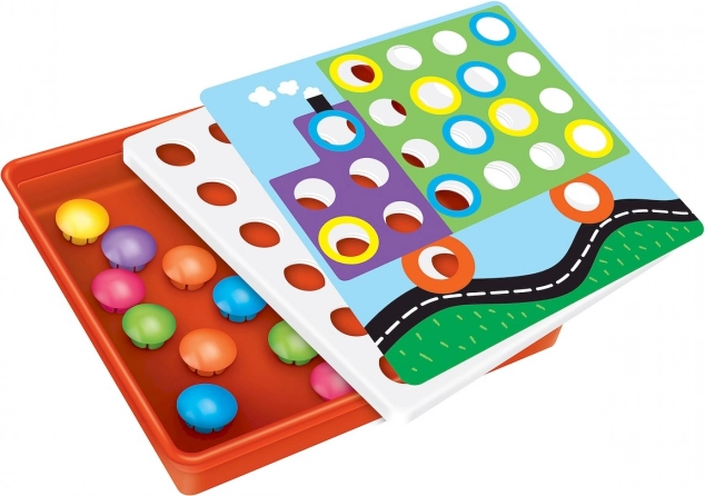 Začnite igrati tako, da odstranite prozorno folijo in vzamete barvite okrogle vzorce. Izberite kartico, jo položite na prekrivno folijo in začnite igro z nameščanjem okroglih koščkov na prava mesta.