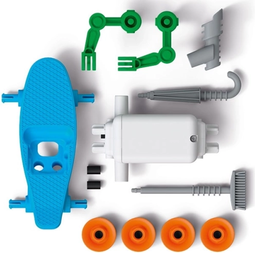 - motor z menjalnikom in baterijskim modulom, deli robota, barvne nalepke, navodila
